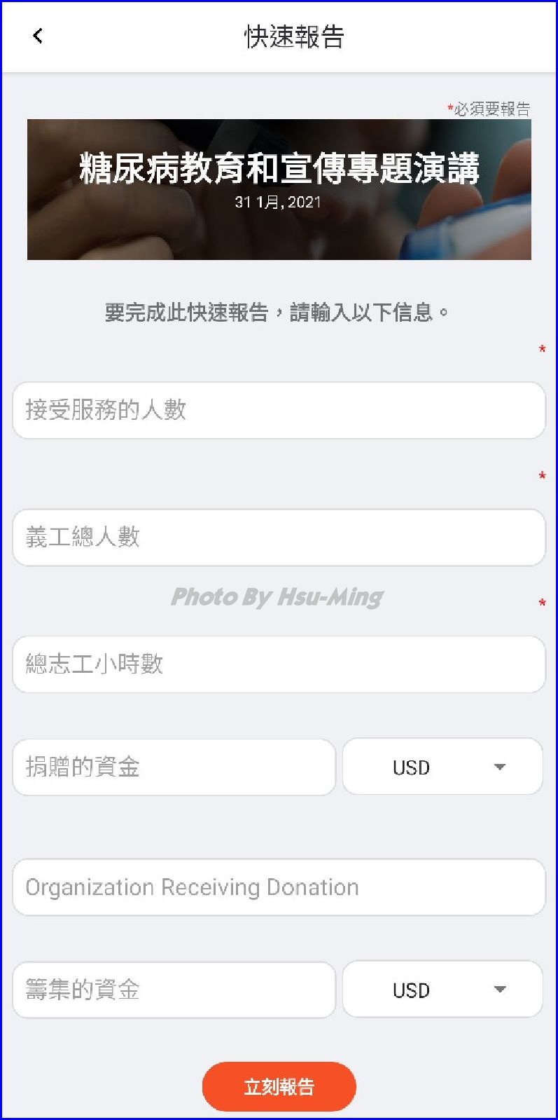 當您完成建立一則社會服務活動後請繼續完成報告